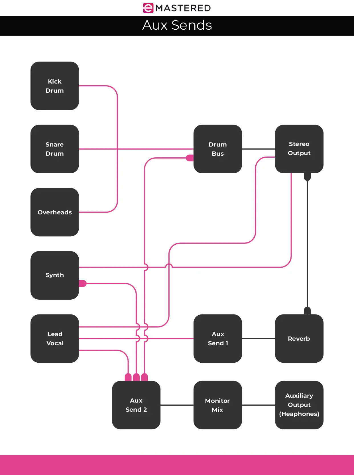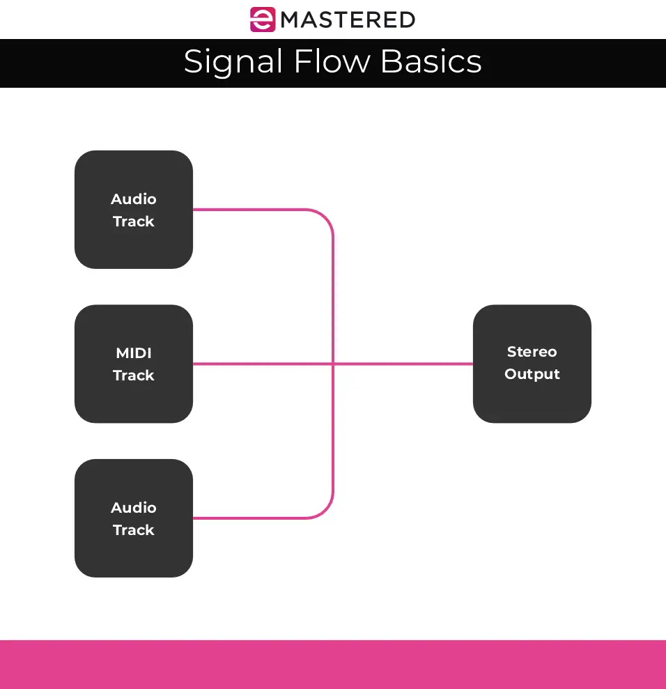 ولزيادة إرباك الأمور، غالباً ما يُستخدم مصطلحا aux و bus لوصف نفس الشيء في مختلف برامج DAWs، ولهذا السبب من المهم معرفة الفرق بين aux و bus، وما هي وظيفة كل منهما. لنبدأ بإلقاء نظرة على بعض تدفقات الإشارة الأساسية.
