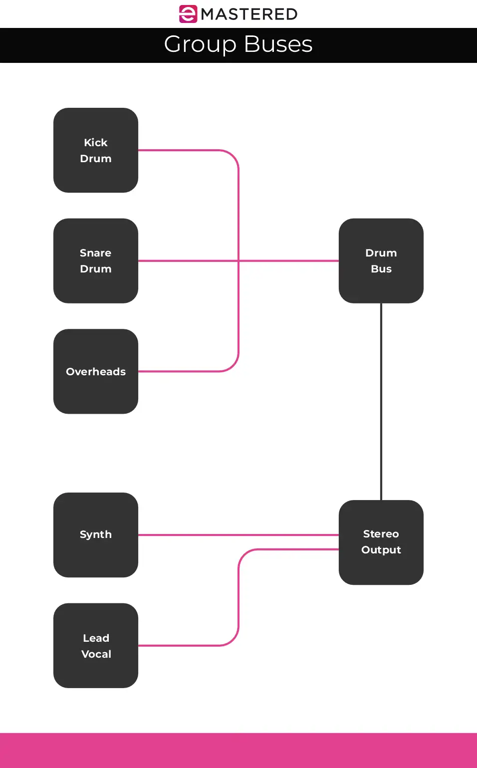 في الرسم البياني أعلاه، يتم توجيه الإشارات من مسارات طبول مختلفة عبر ناقل طبول. وينتهي هذا الناقل في قناة واحدة للتحكم في المستوى الكلي لجميع ميكروفونات الطبول.