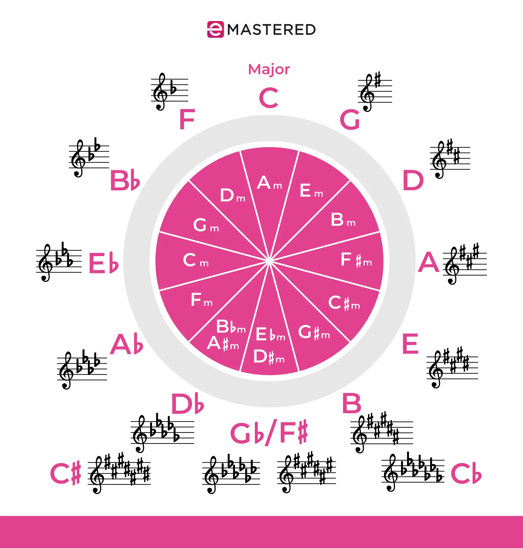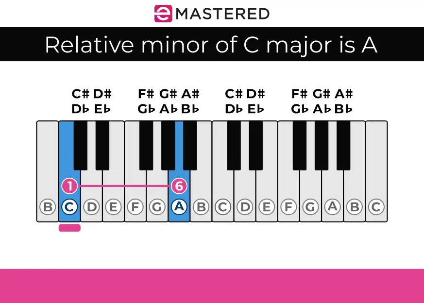 في الصورة أعلاه، ستلاحظ أن كل مفتاح رئيسي مقترن بمفتاحه الثانوي النسبي الموجود أسفله مباشرةً. يشترك هذان المفتاحان في جميع النغمات الموسيقية نفسها ولهما نفس التوقيع المفتاحي ويمكنك العثور على كل مفتاح ثانوي نسبي بمجرد التحرك لأسفل ثلاث نغمات نصف نغمات. وبالطريقة نفسها، لكل مفتاح ثانوي مفتاح رئيسي نسبي، لذا يمكنك استخدام النظام نفسه للعثور على مقياس رئيسي نسبي.
