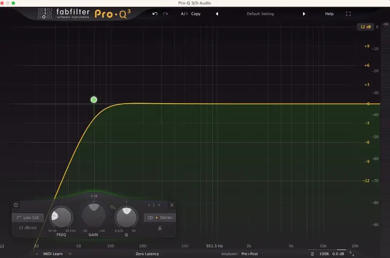 عادةً ما أبدأ بتشغيل مرشح تمرير عالي بميل يتراوح بين 12-24 ديسيبل/أوكتاف. يعتمد اختيار الميل على مدى "طبيعية" الصوت الذي أريده أن يبدو "طبيعيًا". المنحدر اللطيف يبقيها أكثر طبيعية، بينما المنحدر الأكثر حدة سيبدو أكثر عدوانية، وهو مثالي إذا كنت بحاجة حقًا إلى تنظيف المنزل.