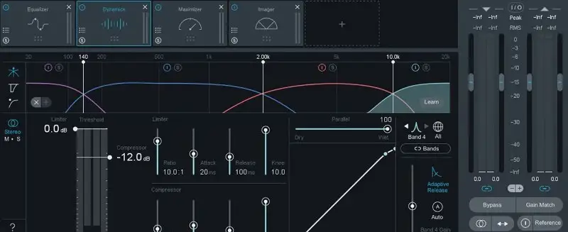 With multiband compression, the incoming signal is split into several defined bands. Many multiband compressors split the frequency spectrum into four bands, though others allow for more.