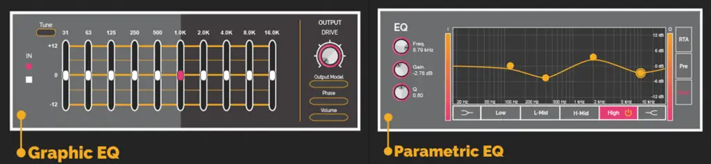 Parametric EQs offer more precision when you need specific frequency adjustments to your drum sound, boost or cut levels, and bandwidth control.