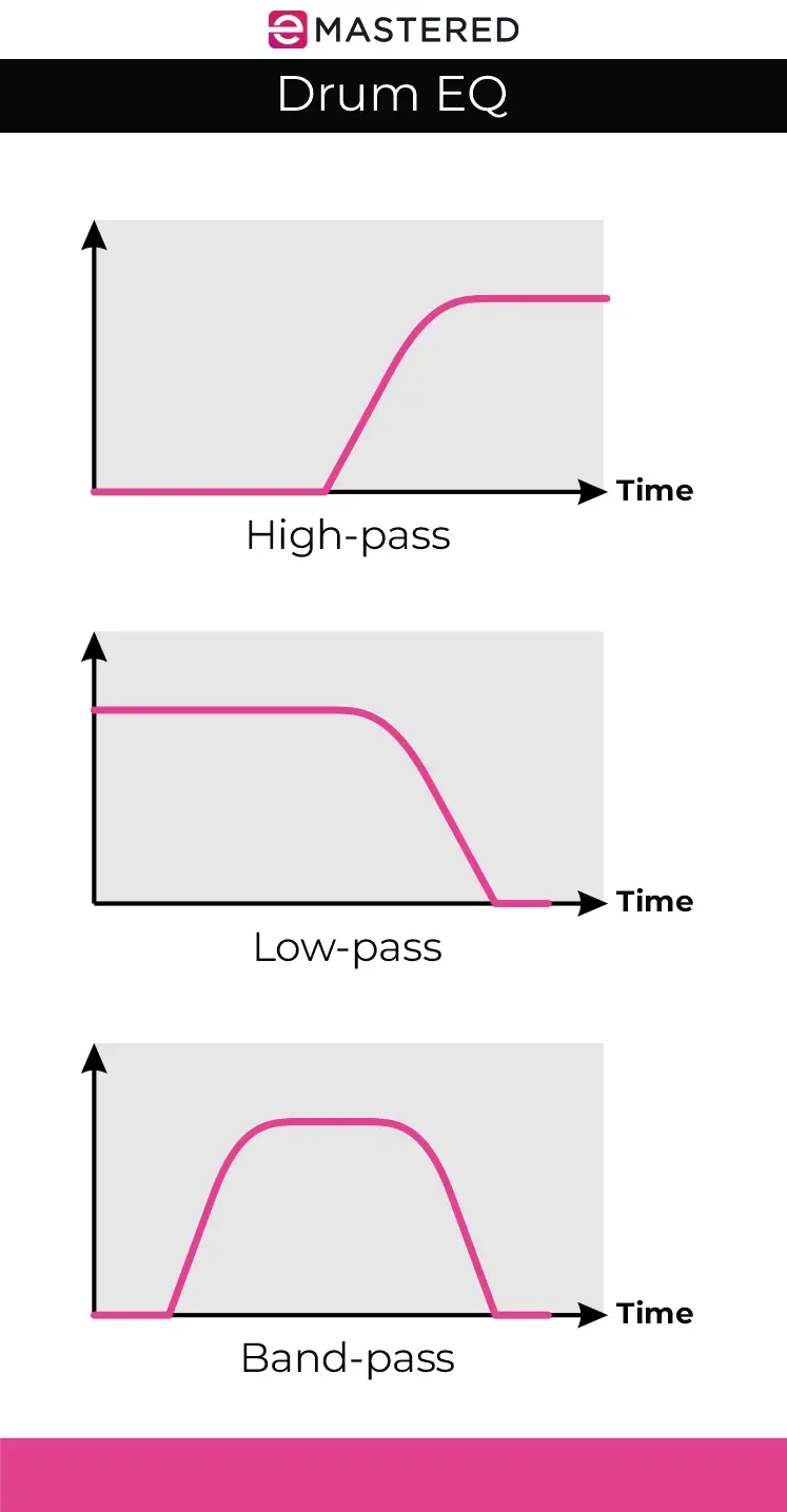 By using these filters, each drum component occupies its own space in the mix, enhancing the balance of your track. In general, HPFs can be applied to cymbals, hi-hats, and toms, while a low pass filter can soften cymbal attack and reduce the harshness of snare drums.