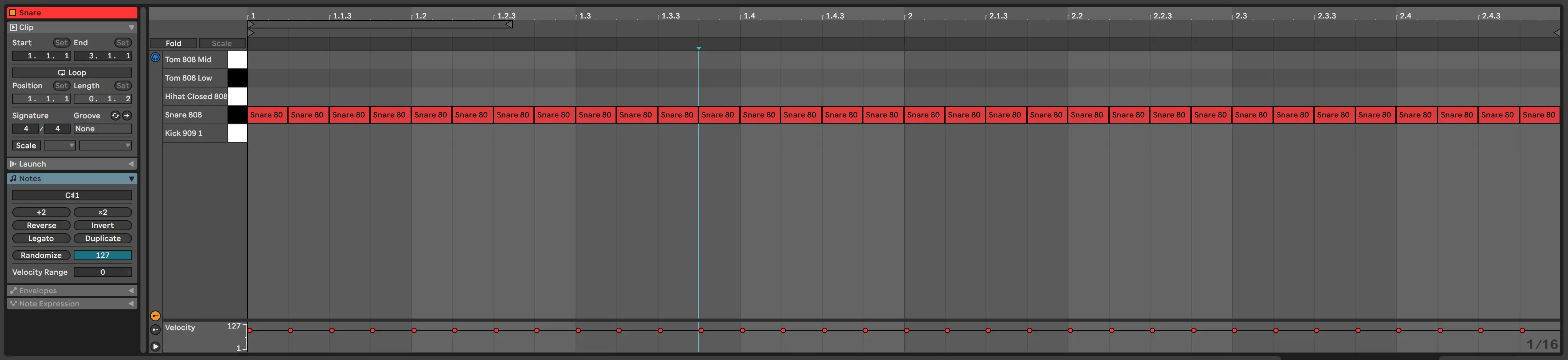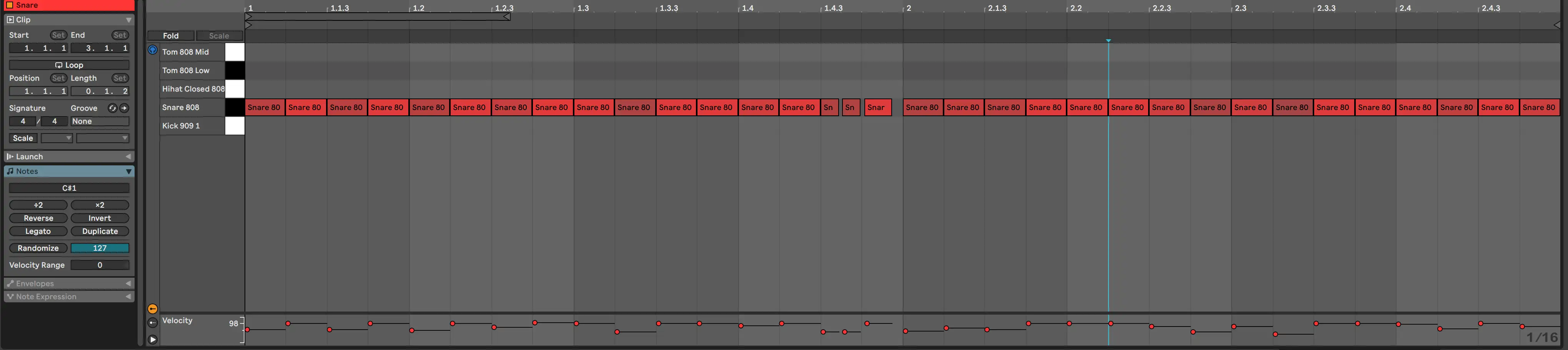 From there, we can adjust the velocity of some of the snare hits where our hats are emphasized to create a small pocket for them to poke out, which makes for a unique groove.