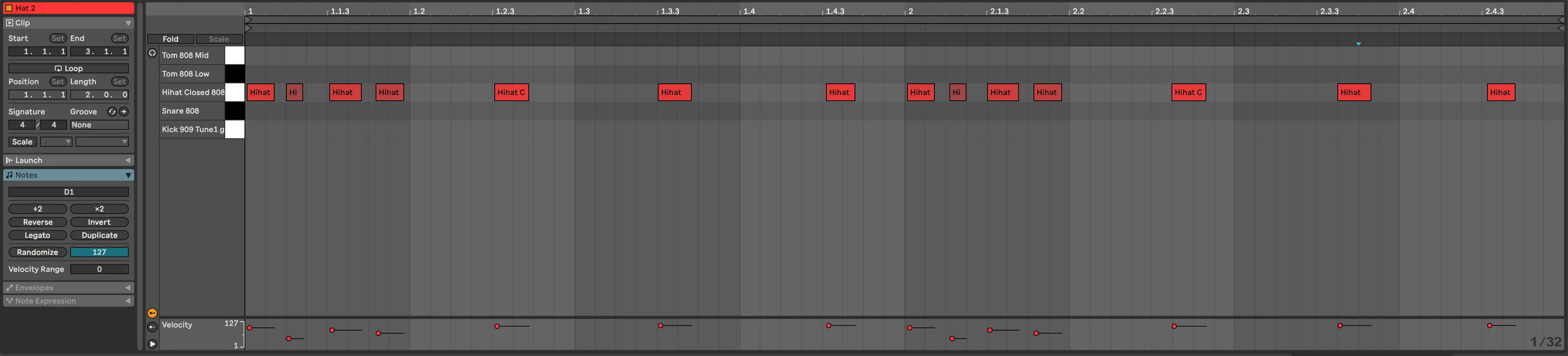 While the toms were playing, I played out a hi-hat rhythm that felt right to me before quantizing it to make up for my sub-par finger-drumming skills.
