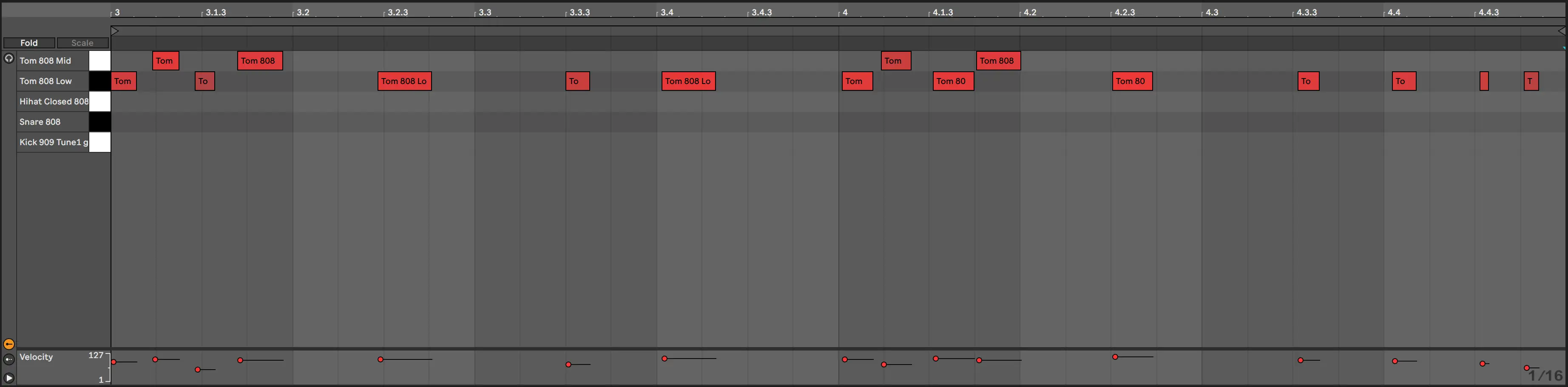 One thing you might notice is if you look at the MIDI groove of both the toms and the hat side by side, you'll see that some of the main points of emphasis match up, which is what I meant earlier by having the two elements play off of one another.