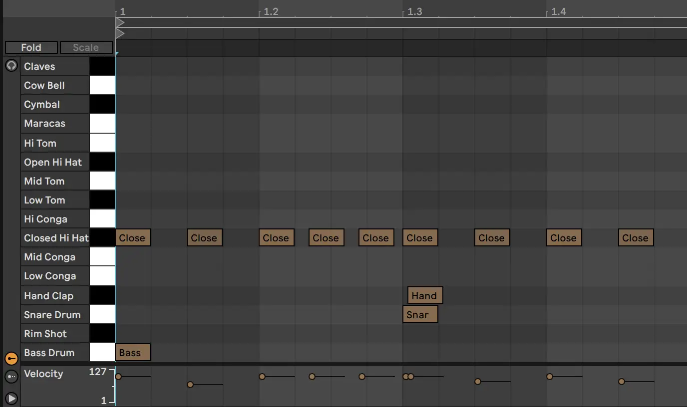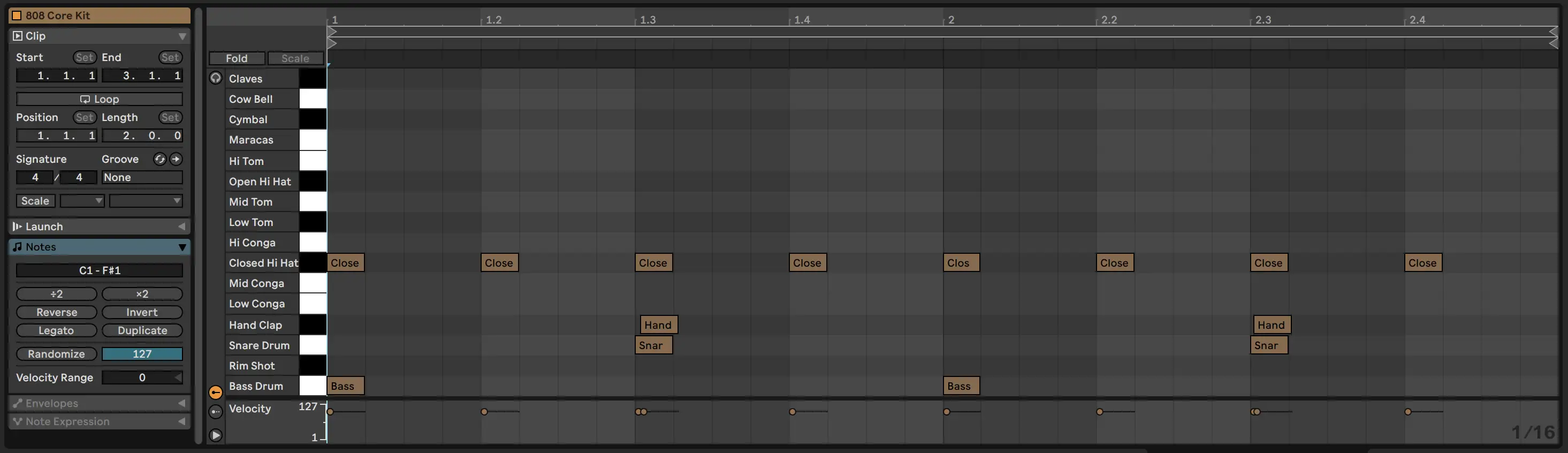Du kan sagtens stoppe her, men jeg kan ofte godt lide at justere hastigheden på mine hi-hats for at få dem til at lyde mere dynamiske og mindre mekaniske. Her er et eksempel på, hvordan du kan justere hastigheden på dit hatmønster: