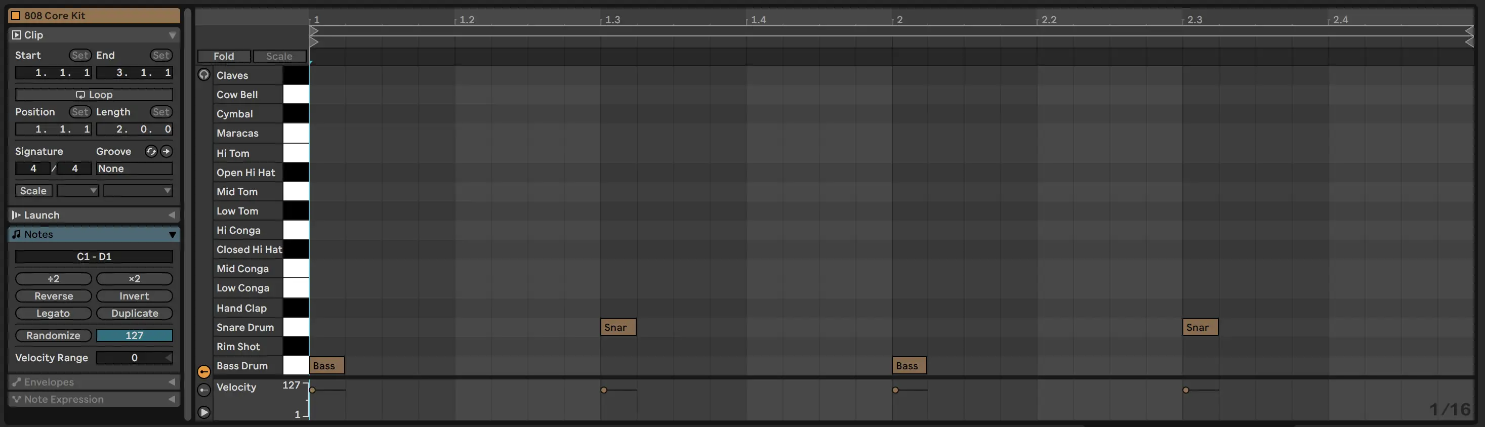 Jeg arbejder i Ableton, når jeg laver trap-beats, så jeg kan godt lide at have mine samples indlæst i Drum Rack og klar til at gå i gang. På den måde kan jeg bruge beat-pads'ene på min MIDI-controller og banke ideer ud i stedet for bare at placere noder på MIDI-grid'et. Af hensyn til indlæringen vil vi dog gå trin for trin, som om vi tegnede vores trap-trommemønstre i stedet for at spille dem.