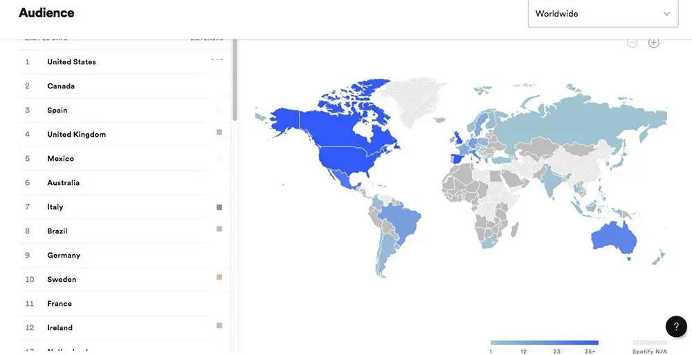 Schließlich können Sie den Abschnitt "Publikum" auf Ihrer Spotify-Seite für Künstler nutzen, um zu sehen, wer Ihre Musik hört und wo sich diese Personen befinden. Diese Daten sind eine hervorragende Information, wenn Sie eine Tournee planen. Wenn nicht, macht es zumindest Spaß, sich die Karte anzuschauen und all die Länder mit ihren unterschiedlichen Schattierungen auf der Grundlage Ihrer Hörerschaft zu sehen.