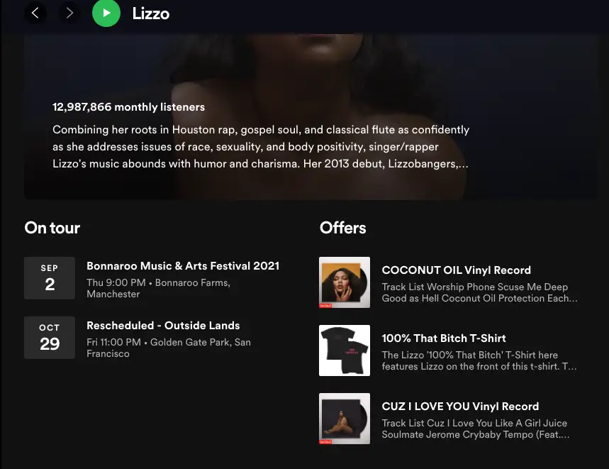Ihre Spotify-Künstlerseite ist mehr als nur ein Platz für Ihr Foto und Ihre Biografie: Sie ist eine Quelle für Informationen über Ihre Hörer. Sie ist auch ein Ort, an dem Sie anstehende Veranstaltungen und Touren ankündigen, Merchandise-Artikel verkaufen und - was vielleicht am wichtigsten ist - an dem Ihr Publikum Sie kennenlernen kann.
