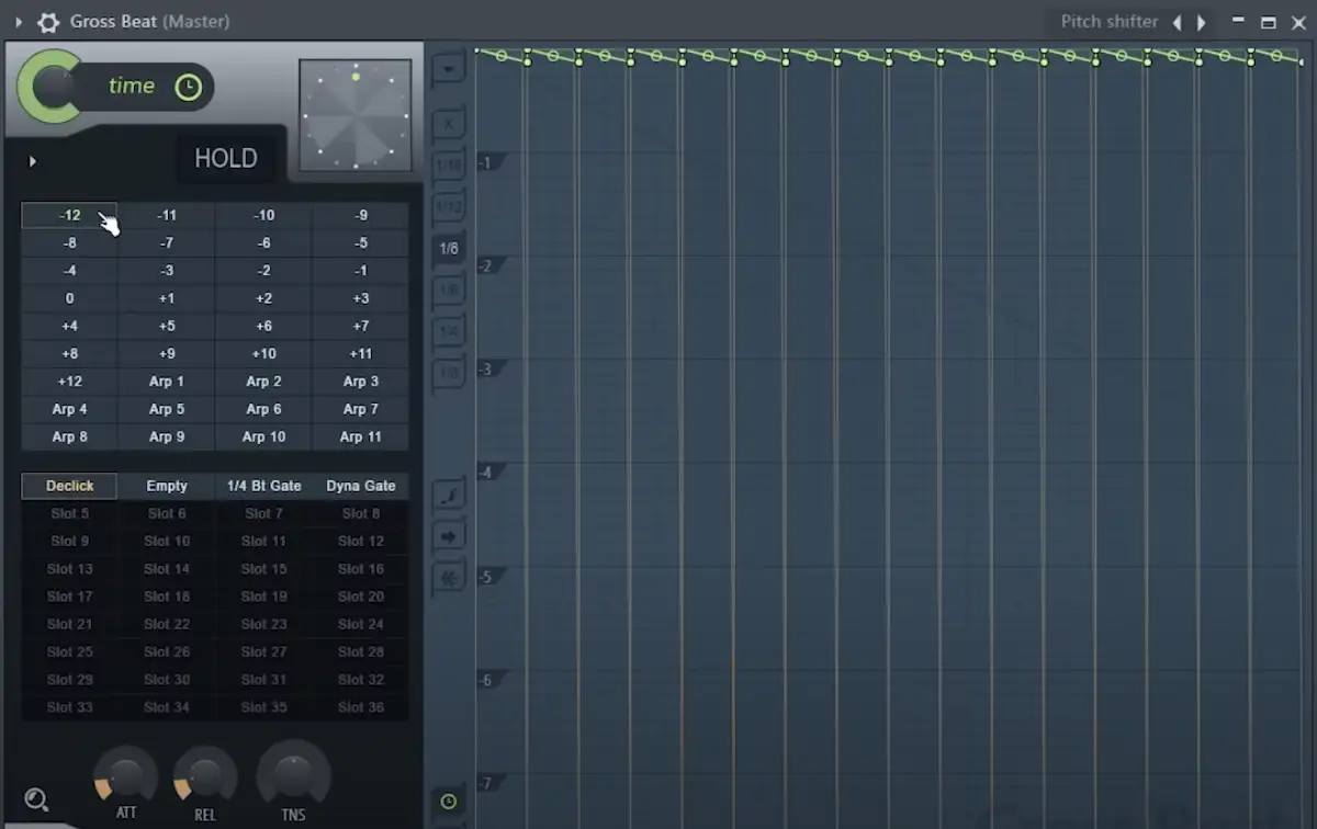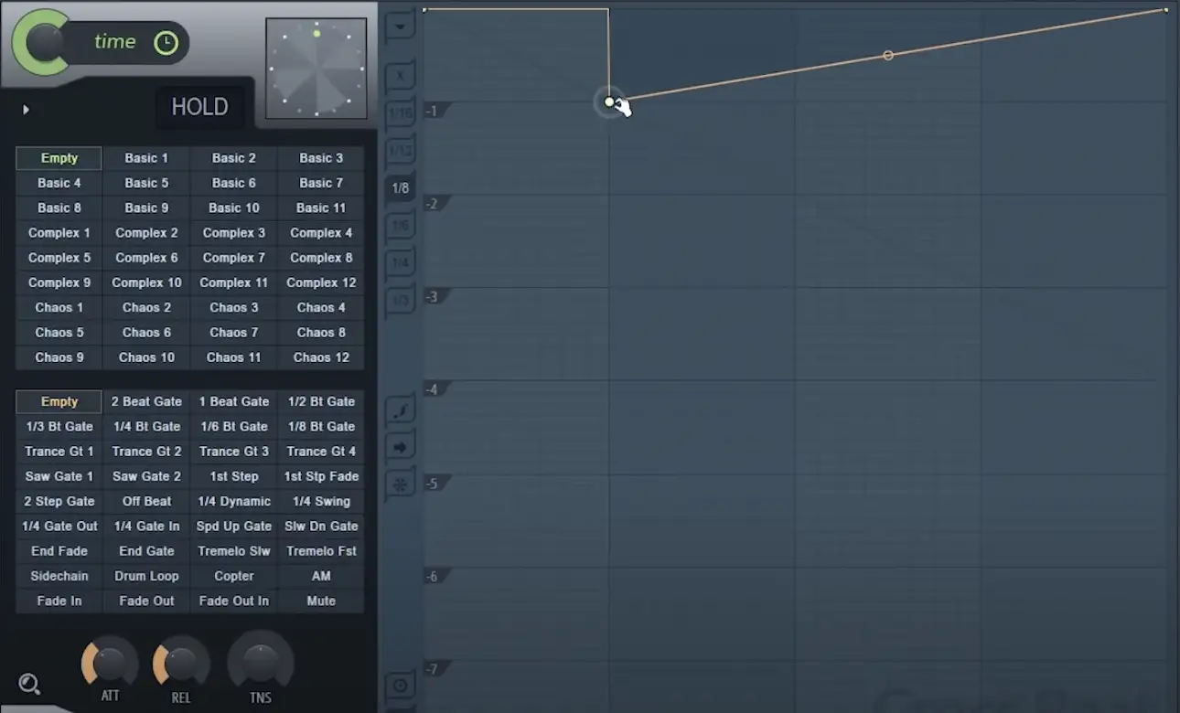 Ähnlich wie bei den Zeitslots bietet Gross Beat 32 voreingestellte Slots für die Lautstärkemanipulation. Sie können jeden Slot mit Ihren eigenen Lautstärkekurven anpassen, einschließlich Attack, Release und Tension, die die Neigung der Attack- und Release-Zeiten anpasst.