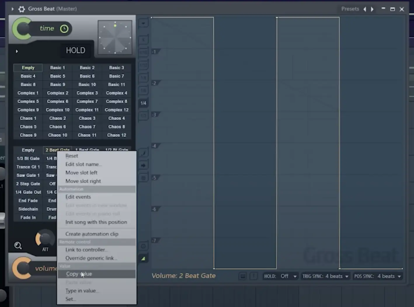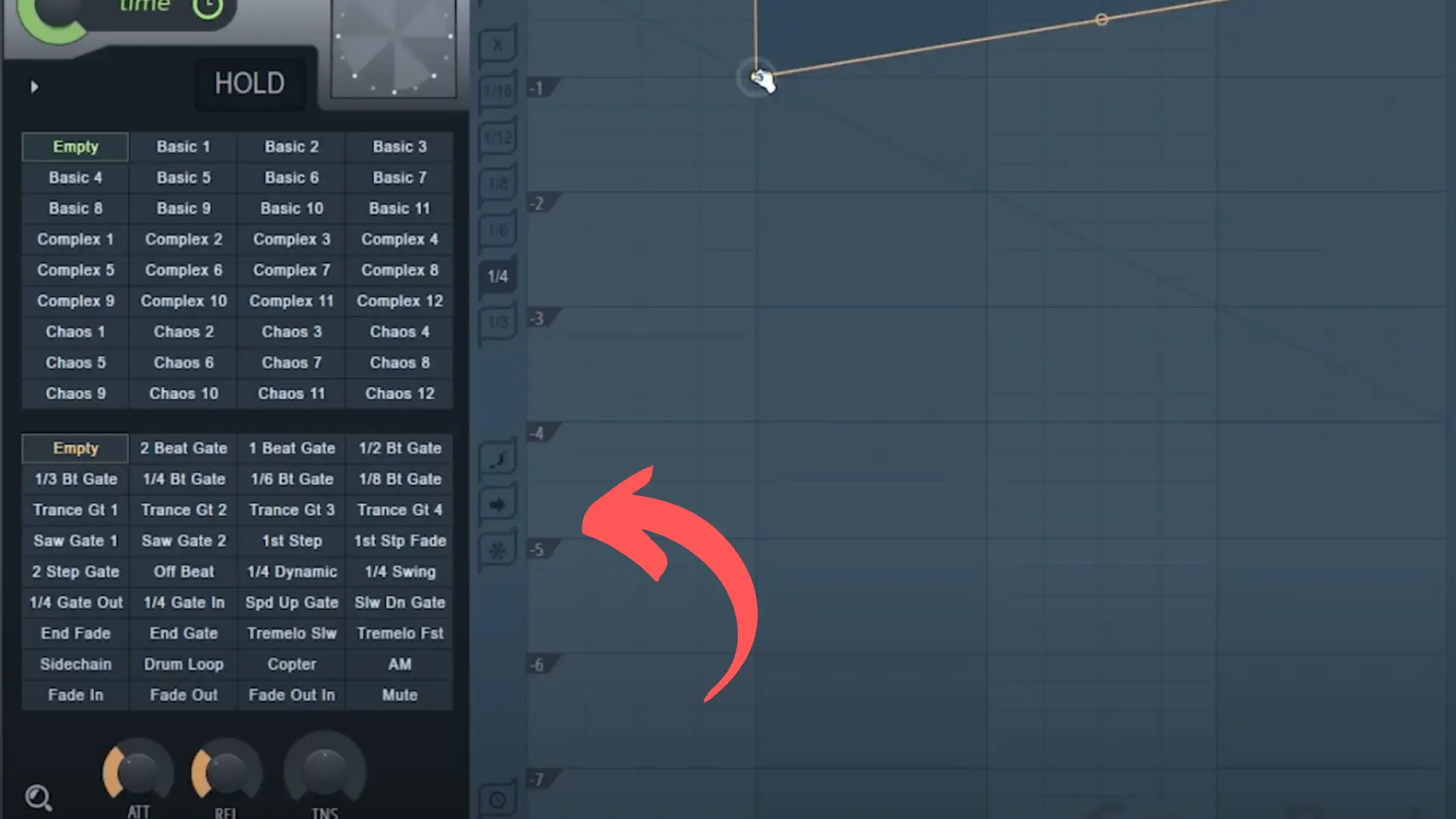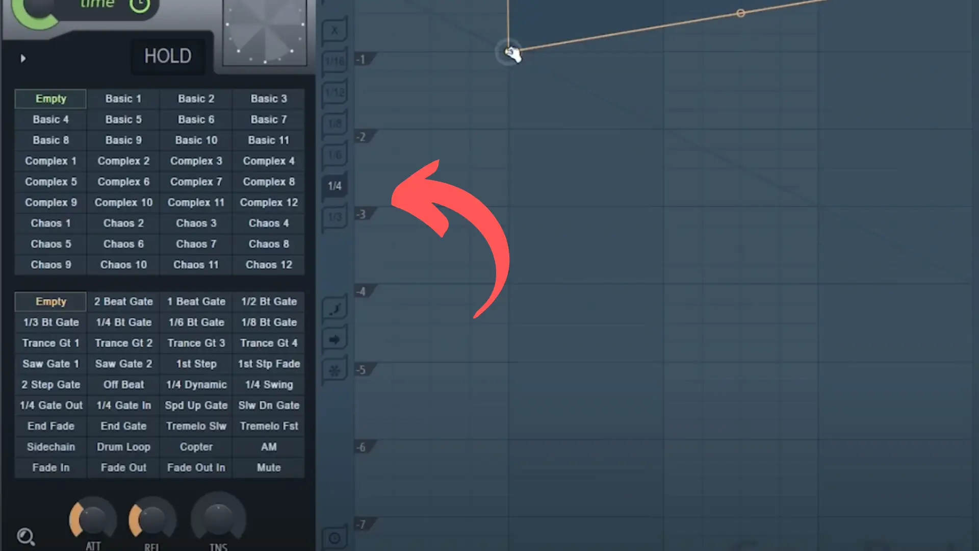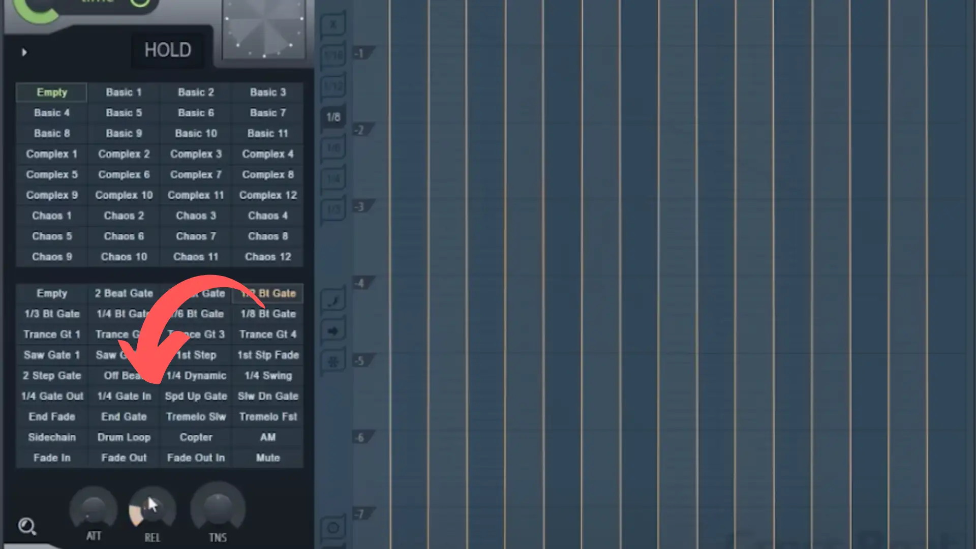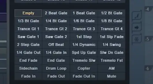 Nehmen wir zum Beispiel an, dass wir unser Pattern mit dem 2-Beat-Gate-Lautstärkehüllkurven-Pattern beginnen wollen, über das wir vorhin gesprochen haben, das wir aber schließlich automatisieren wollen, um zur Trance-Gate-Lautstärkehüllkurve und dann wieder zurück zu gelangen.
