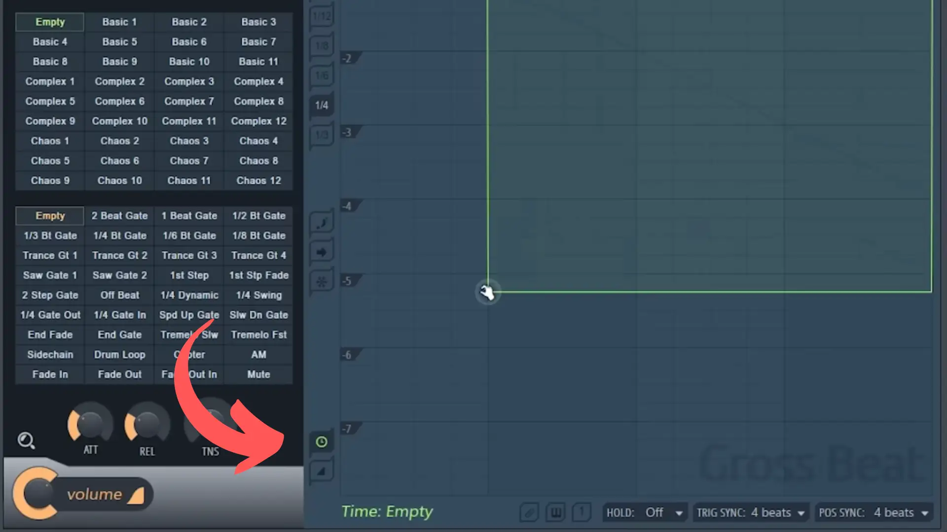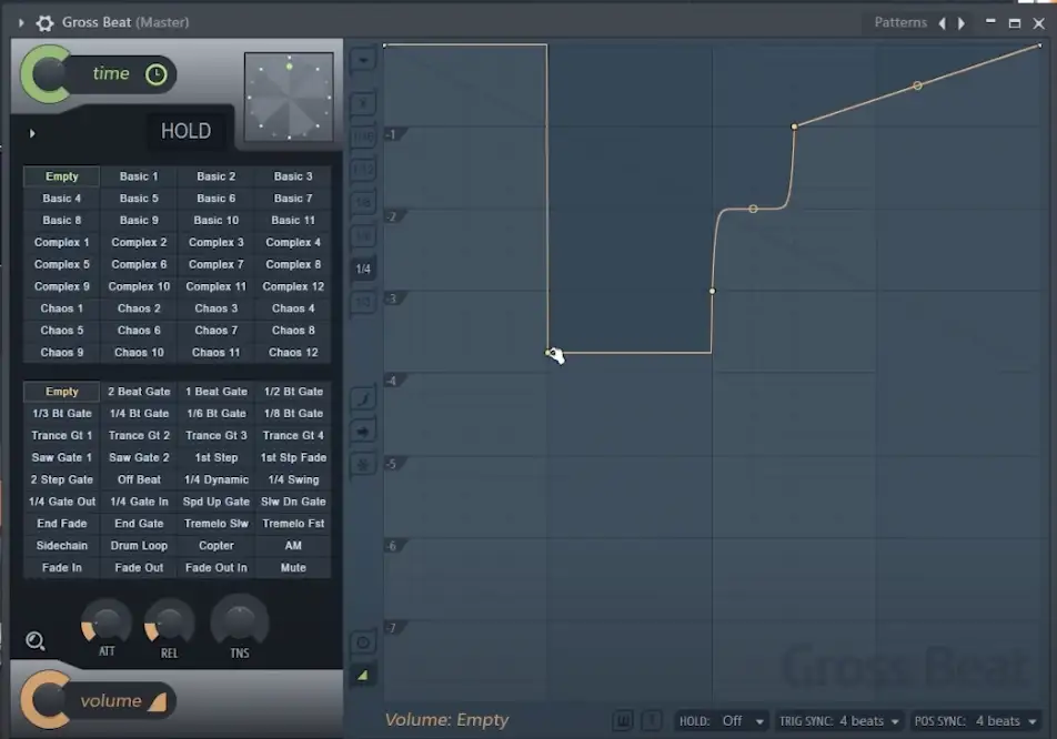 Wenn Sie zunächst einen leeren Slot in der Lautstärkemanipulation auswählen, erhalten Sie das anfängliche Patch auf Gross Beat mit der Hüllkurvenlinie oben, d. h. es passiert nichts.