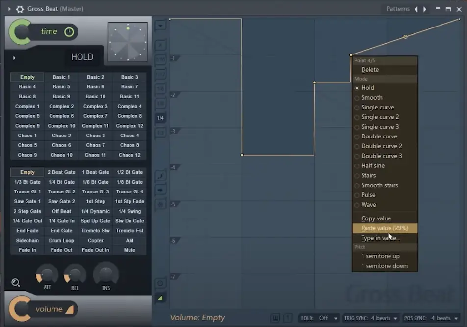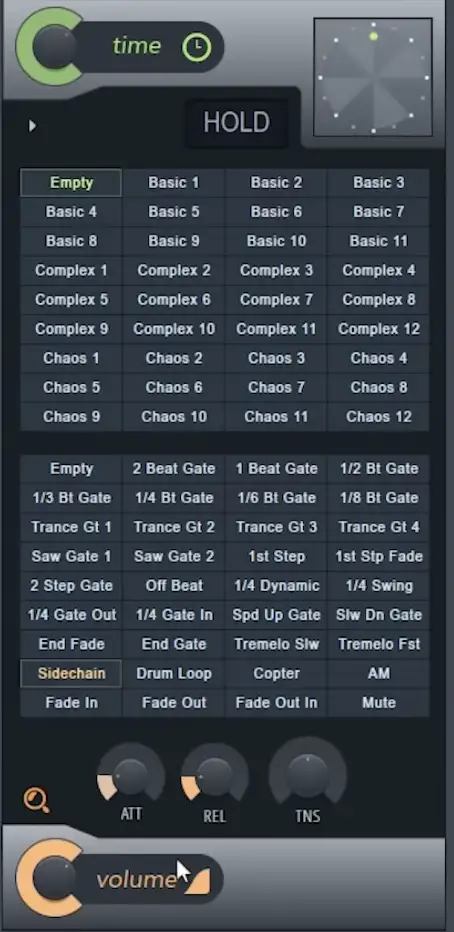 Eine weitere Sache, die ich in Bezug auf die Lautstärkehüllkurve ansprechen möchte, ist, dass es Voreinstellungen gibt, mit denen man herumspielen kann. Das Plugin wird mit dem Standard-Preset ausgeliefert, aber Sie können mit den verschiedenen Presets experimentieren, die von Pitch-Shifting über Stutter und Flanging bis hin zu Patterns reichen.