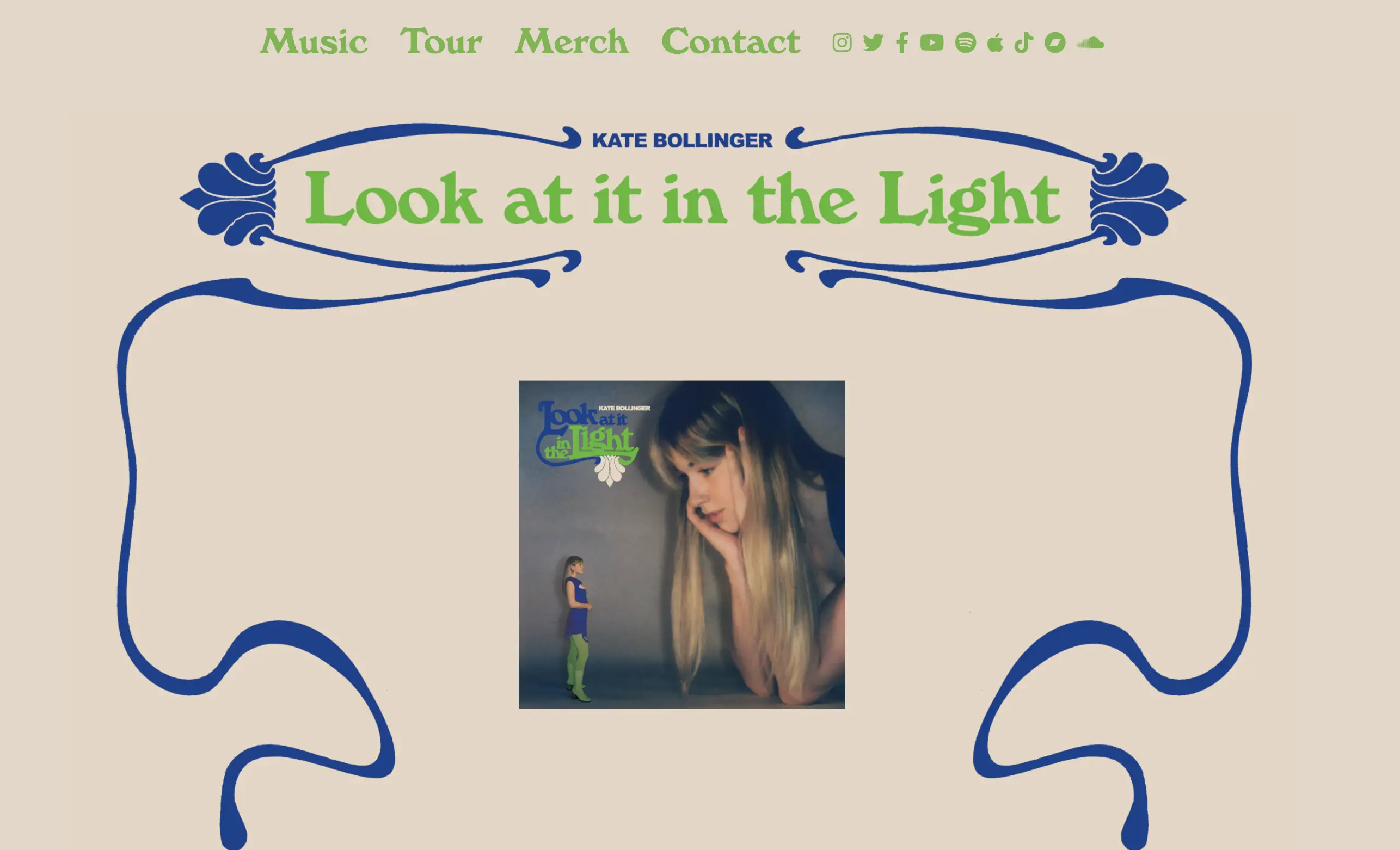 Das EPK von Kate Bolinger ist im Farbschema ihres aktuellen Albums gehalten und dient gleichzeitig als hervorragendes Werbetool. Die grafisch ansprechende Seite enthält alle Links, die man braucht, um mehr über Kates Musik zu erfahren oder ihr Team für Buchungen zu kontaktieren. Es ist ein einfaches, aber effektives EPK, das perfekt in die Welt ihrer Musik passt.