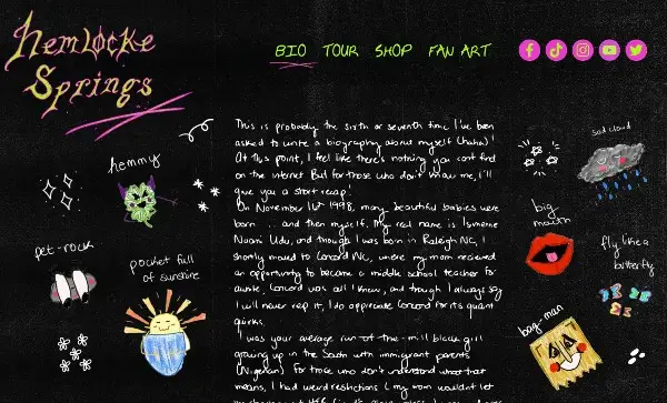 Das EPK von Hemlocke Springs ist ein einzigartiges Werk. Mit einer handgeschriebenen Biografie, persönlichen Anekdoten und gezeichneten Symbolen hat man wirklich das Gefühl, dass man ein Gefühl dafür bekommt, wer sie als Künstlerin ist - und das ist das Ziel eines jeden EPKs. Diese Pressemappe ist mit einer Galerie ausgestattet, die Fankunst zeigt.