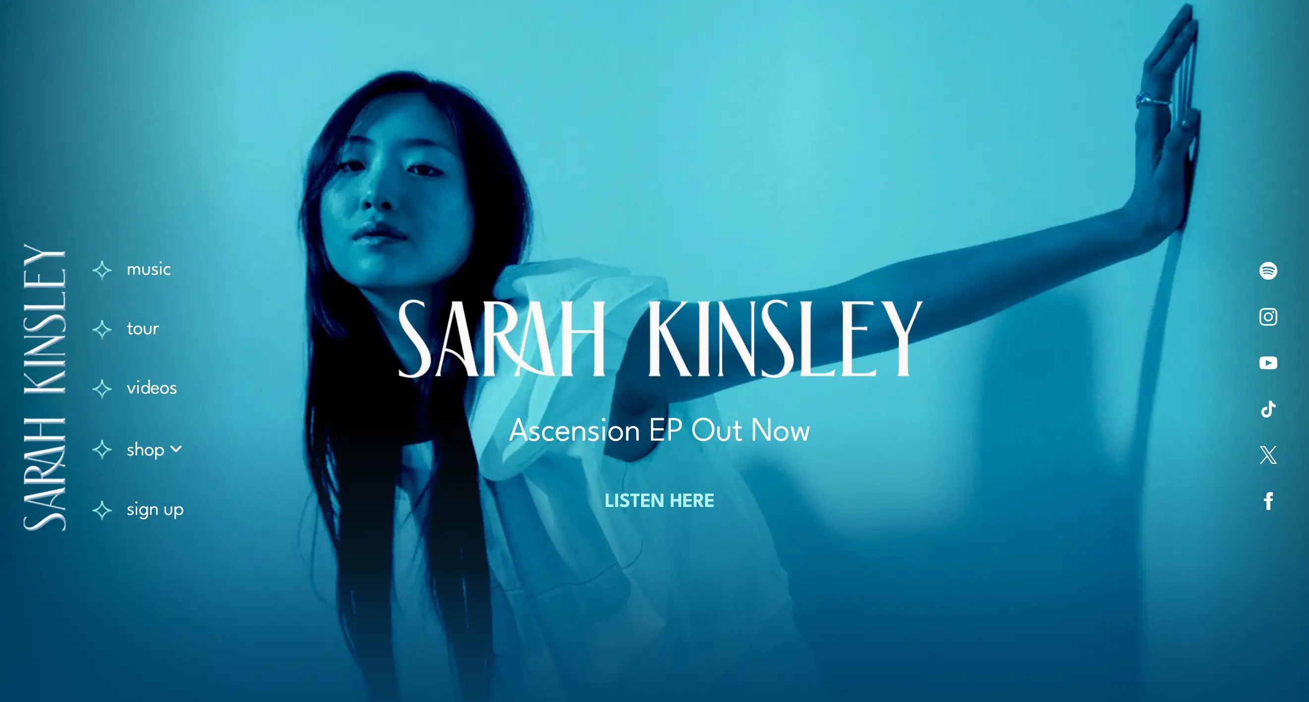 Das schlichte, aber schicke EPK von Sarah Kinsley enthält Links zu ihrer Musik, Videos, Links zu sozialen Netzwerken, Tourdaten sowie eine Schaltfläche zur Anmeldung für ihren Newsletter. Auf der Startseite findet sich ein Hinweis auf das Artwork ihres letzten Albums, damit potenzielle Besucher ihr neuestes Projekt schnell erkennen können.