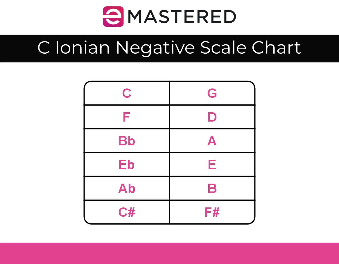 Αν θέλαμε να επεξεργαστούμε την αρνητική κλίμακα για τον Ιωνικό τρόπο C (μείζονα κλίμακα), θα παίρναμε τις σημειώσεις: