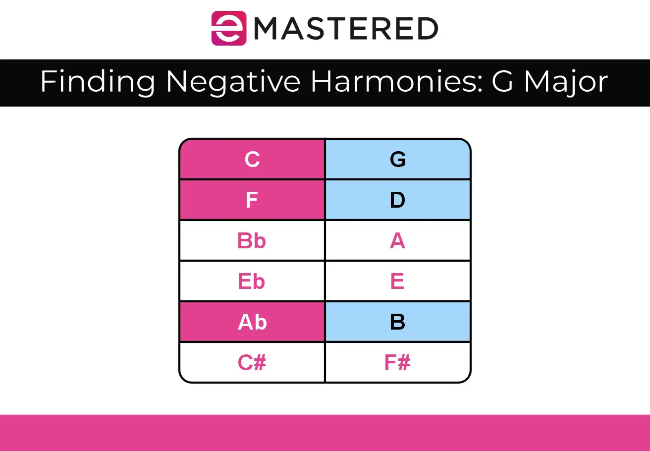 Η ρίζα μιας αρνητικής αρμονίας είναι πάντα μια τέλεια πέμπτη (ή 7 μισά βήματα) κάτω από τη νότα-γεννήτρια. Σε αυτό το παράδειγμα, η νότα της ρίζας της αρνητικής μας αρμονίας είναι το σολ.