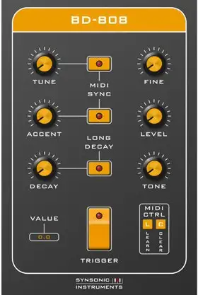 La interfaz gráfica es agradable a la vista e incluye multitud de controles para acentos, ataque, decaimiento, afinación, nivelación y mucho más. No importa qué tipo de 808 requiera tu producción, puedes conjurarlo con el BD-808.