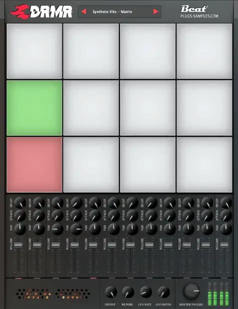 La interfaz está configurada con 12 pads, así como controles para cada pad, que te permiten manipular el ataque, el decaimiento, el volumen y el panorama. Incluso hay controles maestros para la velocidad del LFO, la profundidad del LFO, la reverberación y el corte.