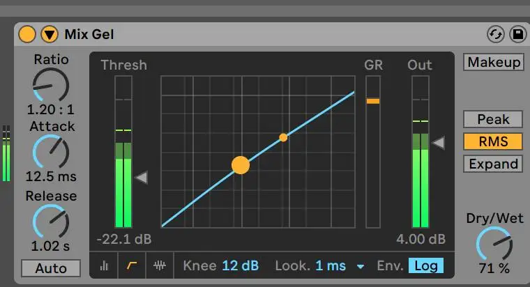 - Finaliza tu compresión y comprueba la reducción de ganancia. Una vez que hayas encontrado un equilibrio feliz, es hora de adaptarse a un umbral más alto y una relación de compresión más baja. Ajusta estos parámetros hasta que hayas conseguido unos 2 o 3 dB de reducción de ganancia o al gusto.