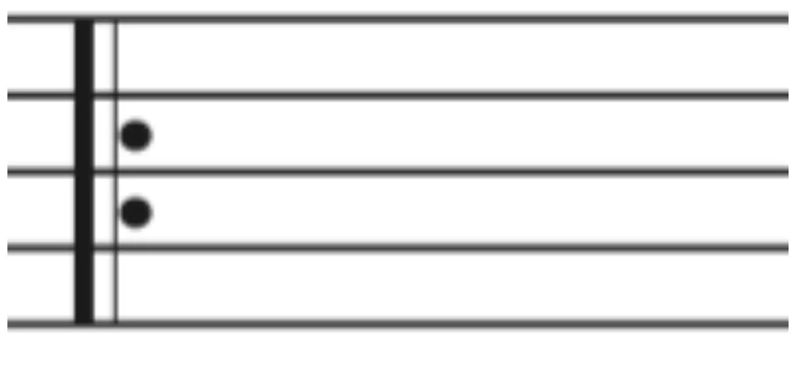 El símbolo de inicio de repetición muestra líneas de compás dobles con dos puntos en el lado izquierdo de un compás. Esto indica dónde empieza una sección repetida.