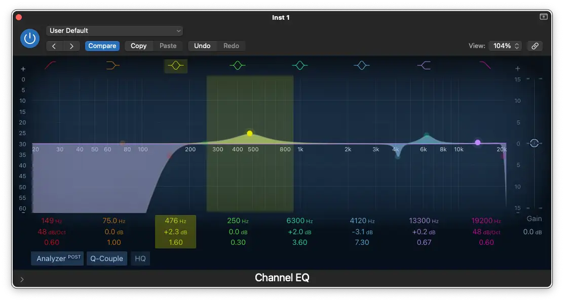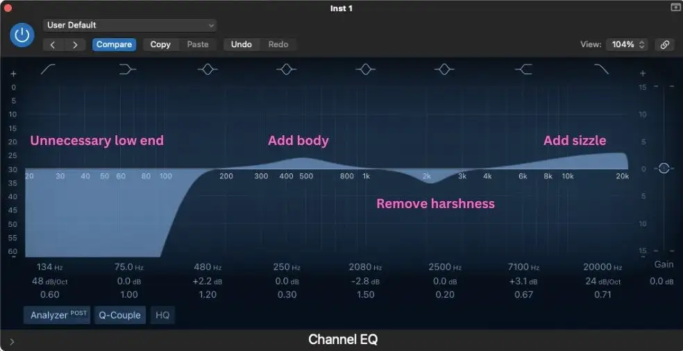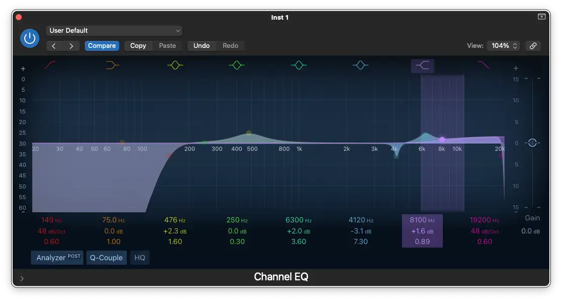 Pour donner à vos chapeaux un aspect poli et aéré, appliquez une légère accentuation de l'étagère haute autour de 7 à 10 kHz. Ajustez si nécessaire pour vous assurer qu'ils ne sonnent pas trop brillants.
