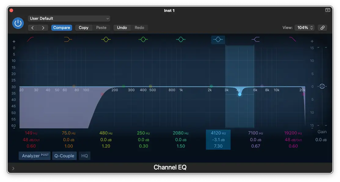 Pour résoudre ce problème, utilisez une bande Q étroite et commencez à balayer entre 3 et 6 kHz avec une amplification pour identifier la bande de fréquence incriminée. Lorsque vous l'avez trouvée, appliquez une coupure d'environ 2 à 4 dB pour lisser les choses.