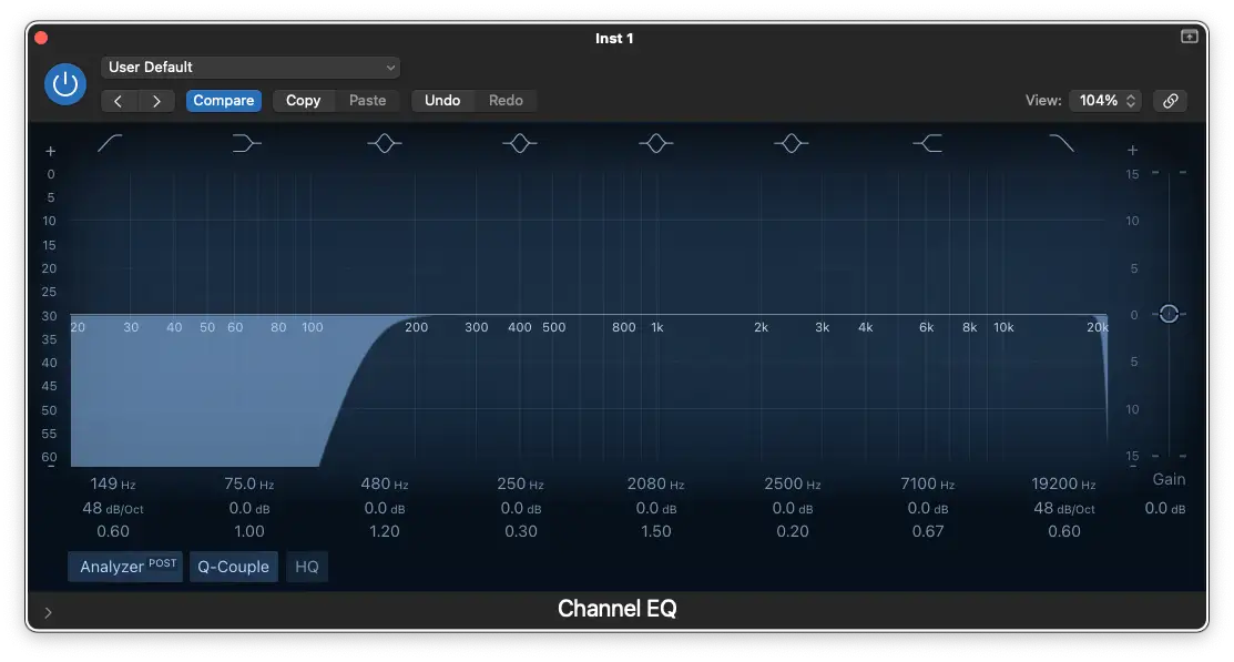 - Installez un filtre passe-haut autour de 150 Hz. Soyez prudent si le batteur joue les chapeaux avec beaucoup de corps ; une réduction plus subtile peut sonner mieux qu'une coupure dans ces situations.