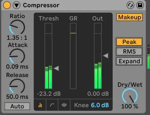 מד הפחתת רווח: זה מראה בדיוק כמה הפחתת רווח נדרשת כדי לדחוס אות. בדרך כלל עליך לשאוף להפחתת רווח של 2 עד 3 dB בעת דחיסת קובץ שמע. ז'אנרים כבדים יותר של מוזיקה עשויים לדרוש הפחתת רווח רבה יותר, אך באופן כללי, אתה רוצה להשאיר יותר מרווח ראש כדי שהאות לא יהפוך למעוך או חסר חיים מדחיסת יתר של קטע. זה גם עשוי להיות הגיוני יותר לבצע אוטומציה של דחיסה רבה יותר בחלקים רועשים של שיר.