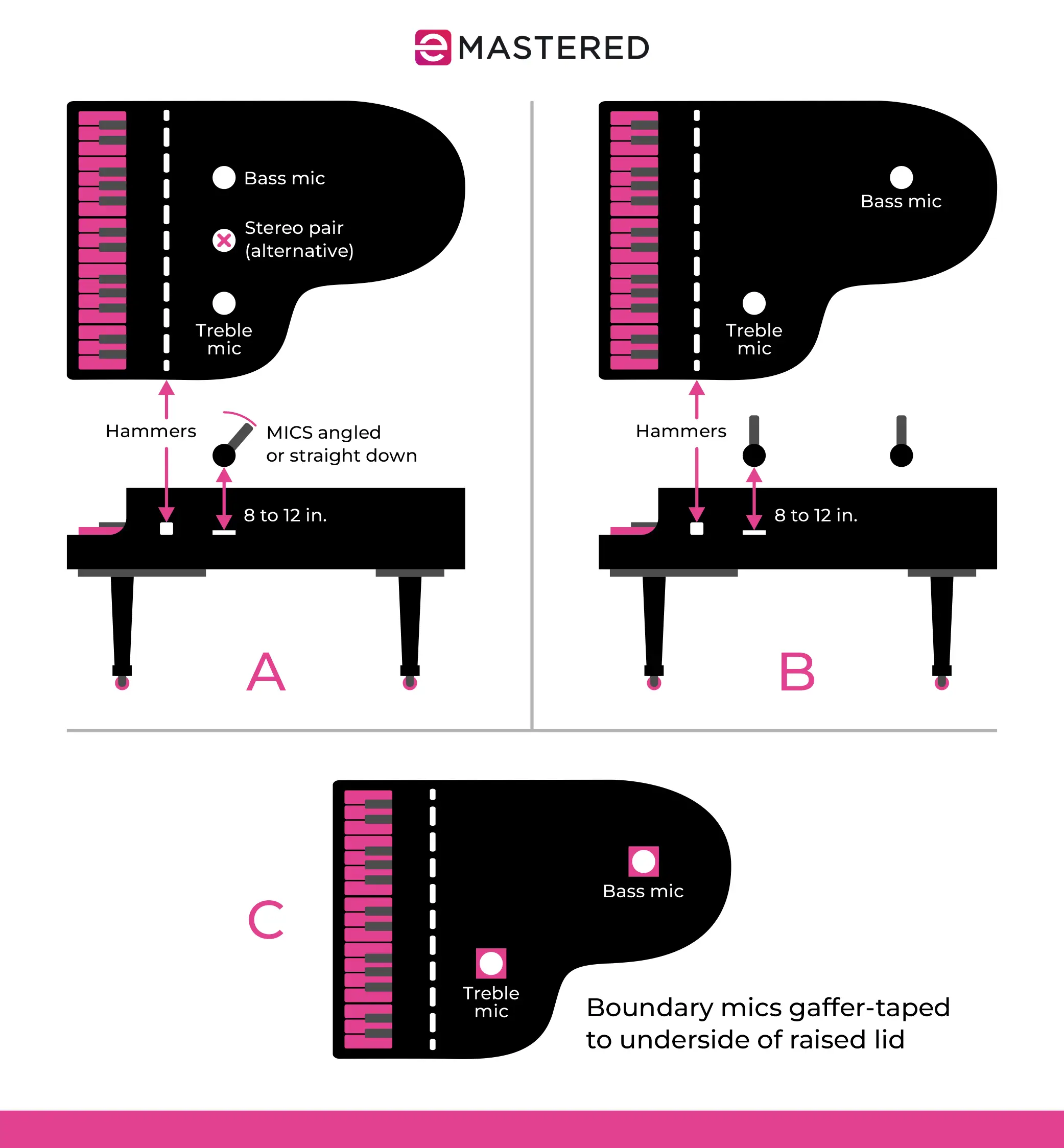 A mikrofon elhelyezése a zongorához képest változhat, de a húrok közepe közelében, közvetlenül a játékos pozíciója felett, vagy a hangfal felé szögben elhelyezve mind jó kiindulópont. Ez fókuszált sztereó képet biztosít, amely még mindig mono-kompatibilis a keveréshez.