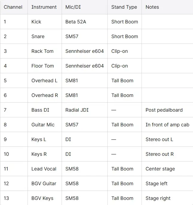 Di luar daftar peralatan, lembar backline yang tepat juga harus menyertakan preferensi penyetelan, persyaratan teknologi, dan segala kebiasaan yang dimiliki oleh pengaturan Anda. Pada dasarnya, harus ada apa pun yang dapat membuat teknisi suara yang lelah pada jam 5 sore saat load-in.
