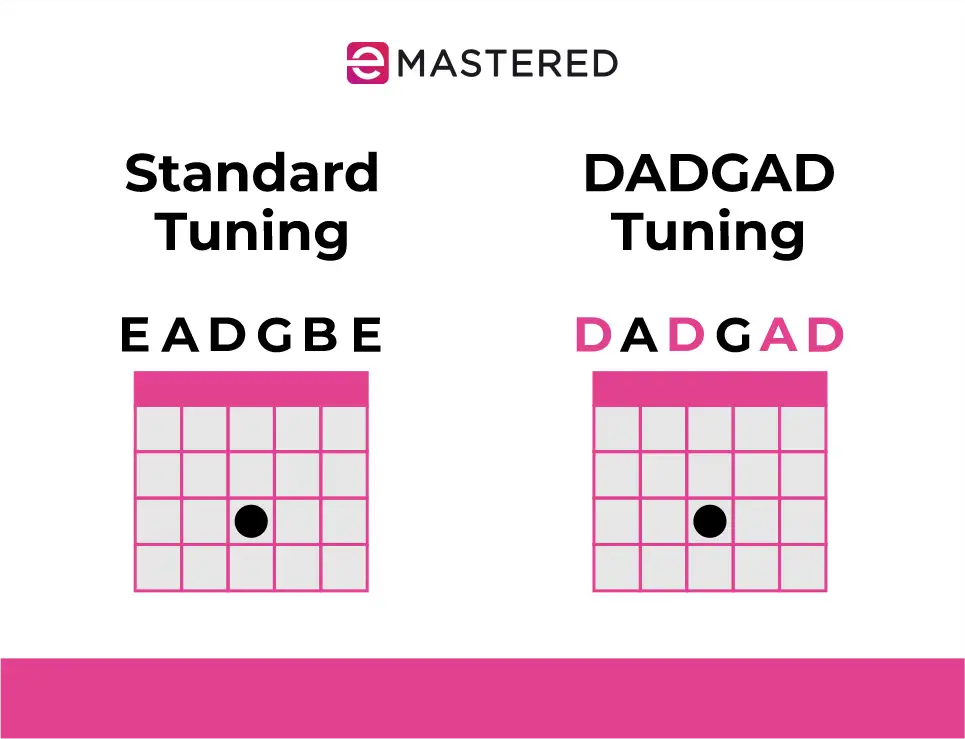 Passare all'accordatura drop D dall'accordatura standard della chitarra è facile. Partendo dall'accordatura standard, è sufficiente abbassare l'intonazione della corda bassa del Mi di un intero gradino fino a D. Questa regolazione cambia l'accordatura delle corde in D, A, D, G, B, E, dalla corda più bassa a quella più alta.