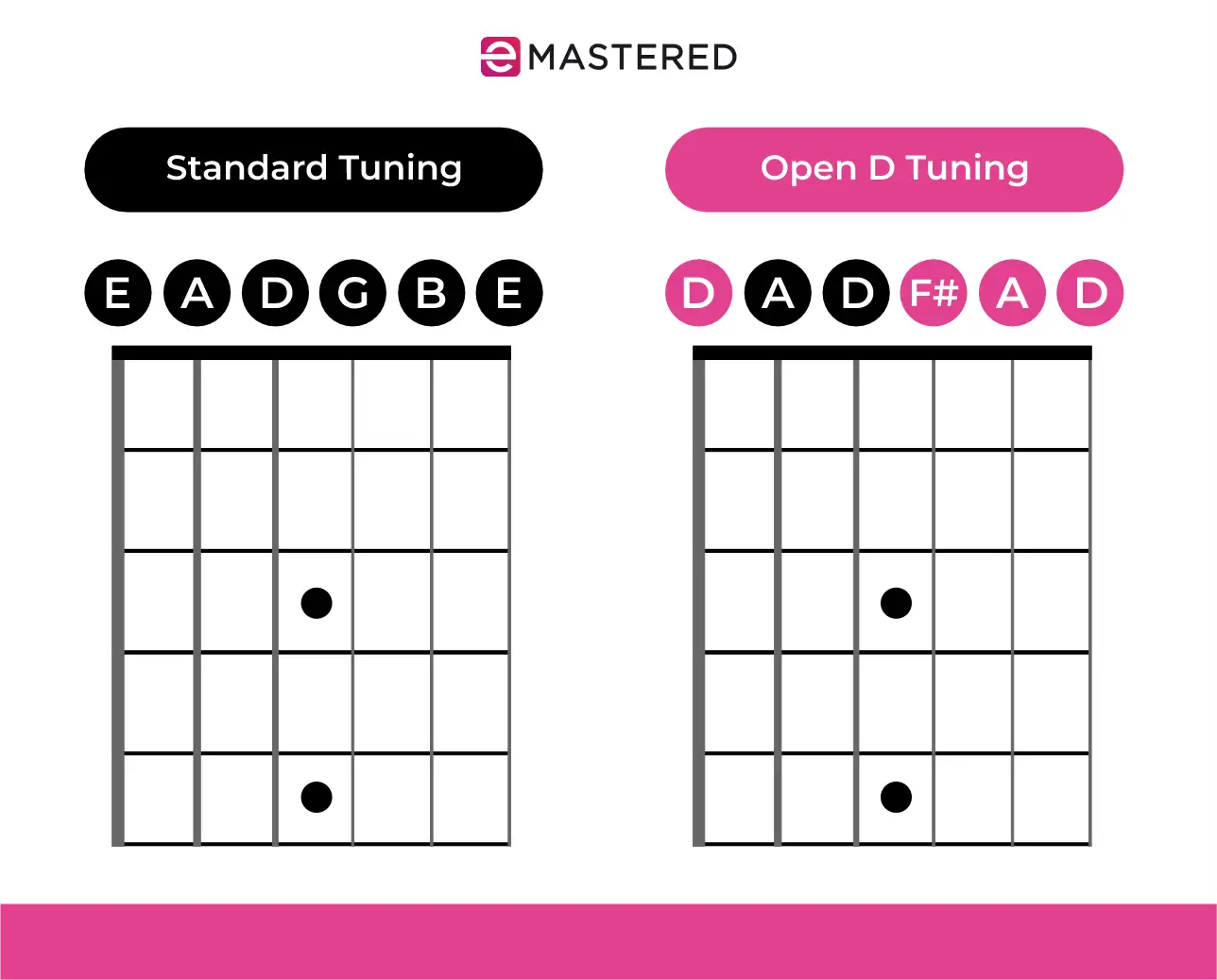 Per passare dall'accordatura standard al Mi aperto, bisogna accordare il La al Si, il Re al Mi e il Sol al Sol#. Si tratta di un passaggio semplice, ma che cambia radicalmente il modo in cui si può suonare lo strumento.