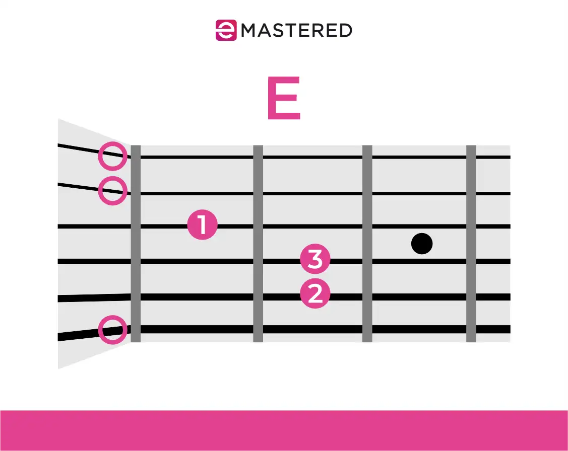 Questa disposizione rispecchia le note dell'accordo di Mi maggiore "cowboy" in accordatura standard. Per suonare un accordo di Mi cowboy standard, di solito si posiziona l'indice sul primo tasto della corda G (che diventa un G#), il medio sul secondo tasto della corda A (che diventa un B) e l'anulare sul secondo tasto della corda D (che diventa un E).