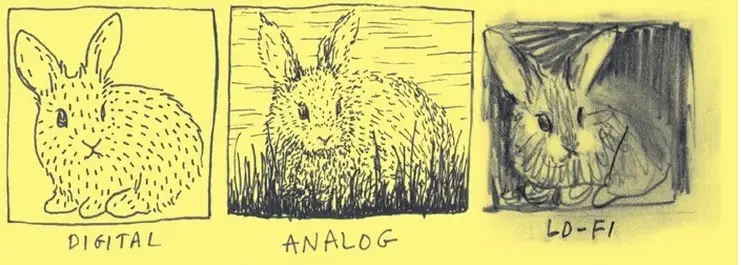 La musica lo-fi è la combinazione di questi due elementi, utilizzando questi suoni analogici come parte della loro musica digitale. Un produttore di musica lo-fi lascia o aggiunge di proposito suoni analogici come scelta artistica.