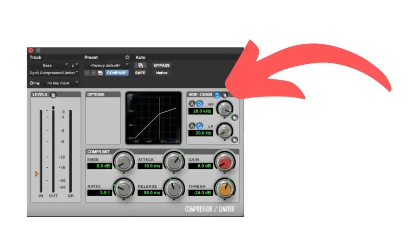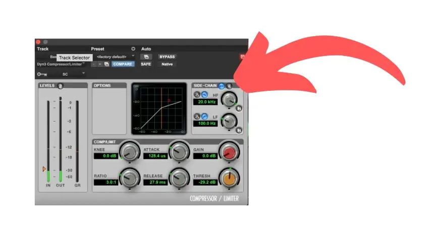 Ad esempio, si potrebbe posizionare un compressore su una traccia di basso e impostare il sidechain sulla cassa, il che significa che la cassa è la traccia che controllerà il compressore.