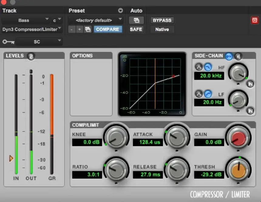 Il compressore interviene sulla traccia con il segnale audio che si desidera eliminare. In genere si tratta della traccia meno importante che si vuole togliere di mezzo rispetto alla traccia più importante. Per mostrarvi come fare, utilizzerò il compressore standard di Pro Tools.