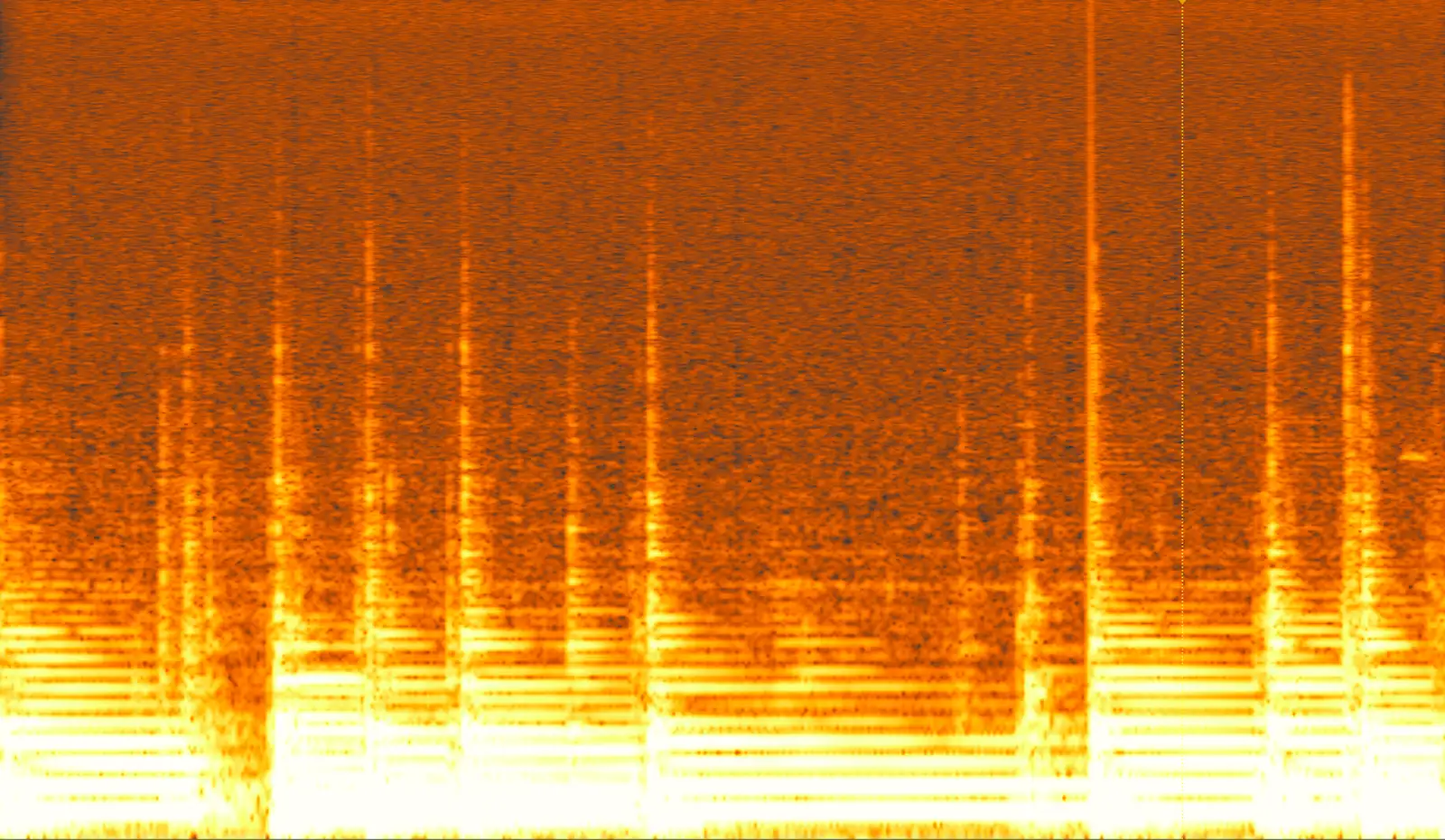 I dette (riktignok støyende) eksempelet på et akustisk bass-lick kan du se de kraftige lave frekvensene som den lyseste delen av bildet. mot bunnen av grafen.