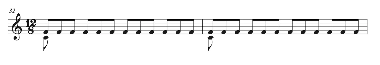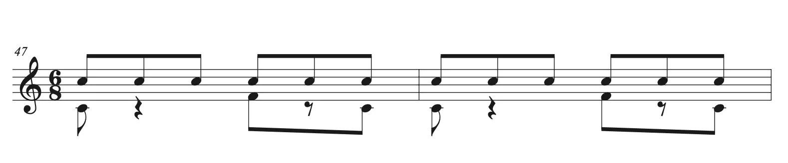 Je vindt sommige melodieën in 6/8, 9/8 of 12/8. Dit betekent dat er 6, 9 of 12 tellen per maat zijn en dat elke tel gelijk is aan een achtste noot. Maten in deze maatsoorten bestaan uit twee groepen van drie achtste noten. Deze maatsoorten worden samengestelde tijd genoemd.