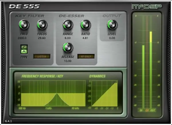 A maior caraterística que se destaca neste plugin de de-esser é a função "look-ahead", que pode aplicar o de-essing cerca de 15ms antes da ocorrência de sibilância severa. Se precisar de domar frequências rápidas e ásperas numa atuação vocal, esta é uma excelente ferramenta.