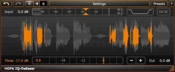 Semelhante à peça de hardware original, este plugin detecta sons sibilantes automaticamente, aplicando compressão usando um método de banda estreita. Essencialmente, procura trabalhar apenas nas frequências sibilantes, deixando tudo o resto intacto.