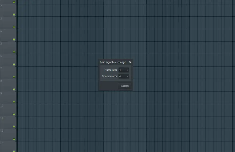 A maior parte da música moderna é produzida numa fórmula de compasso 4/4, no entanto, muitas outras fórmulas de compasso podem ser utilizadas e funcionam perfeitamente bem com a música atual. O FL Studio 20 permite-lhe fazer alterações de compasso na lista de reprodução. Tudo o que tem de fazer é premir Alt+Shift+T e depois clicar em Aceitar, e a alteração do compasso aparecerá no marcador de reprodução da lista de reprodução.