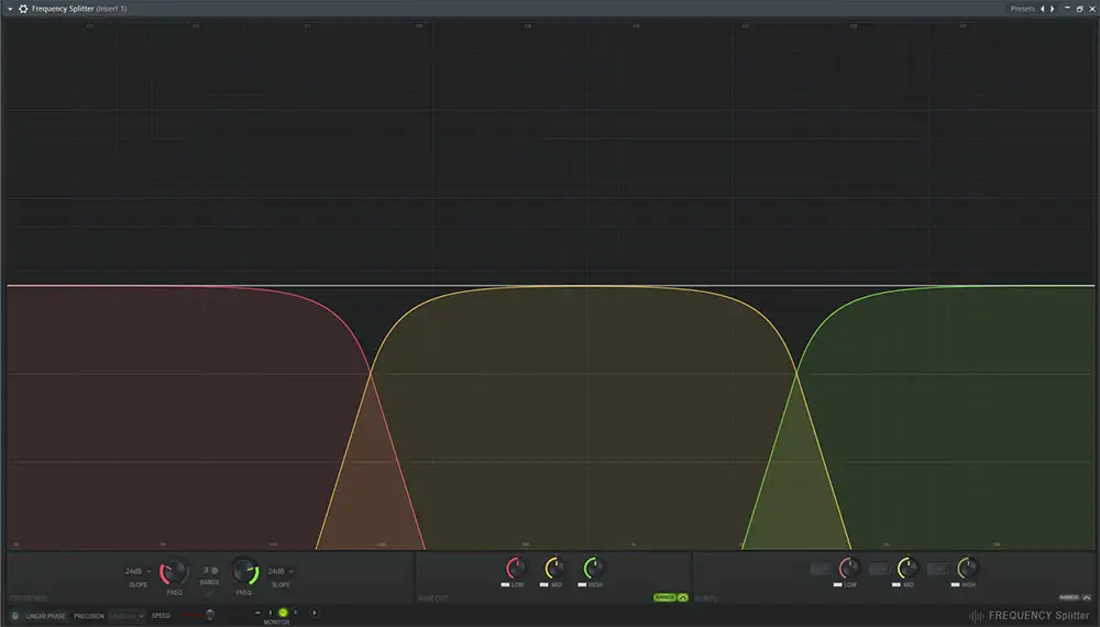 O divisor de frequência separa o áudio em bandas de alta e baixa frequência ou em bandas de baixa, média e alta frequência. Além disso, o divisor de frequência oferece latência zero, filtros de crossover de fase linear de alta fidelidade ou crossovers de fase mínima.