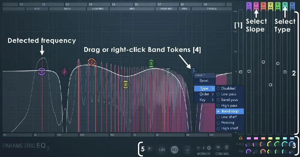 Este é um equalizador paramétrico de 7 bandas com IIR (Infinite Impulse Response) que também vem com um modo FFT (Fast Fourier Transform) de fase linear relativamente avançado. Dá-lhe a capacidade de fazer alterações rápidas nos parâmetros que normalmente não seriam possíveis com os seus filtros FFT convencionais.
