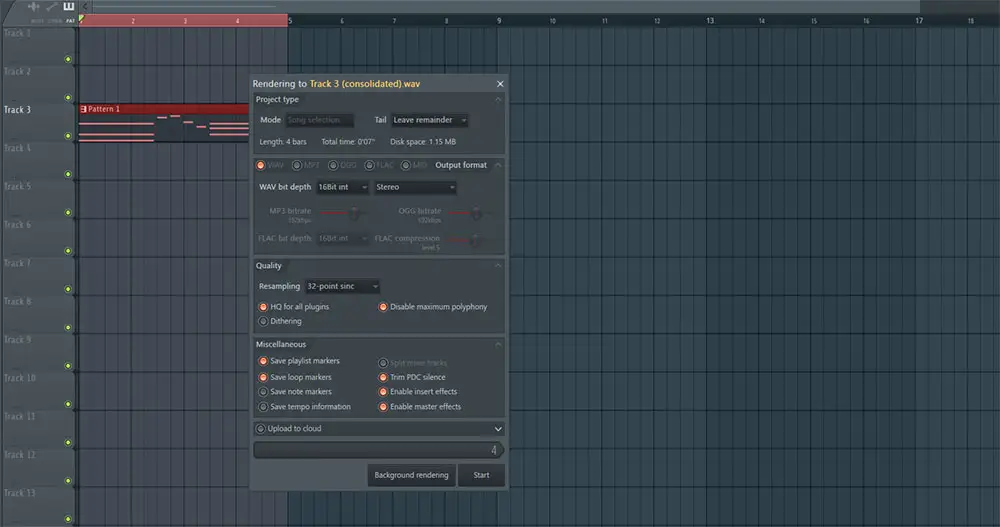 Esta funcionalidade ajudará a sua CPU a utilizar muitos plug-ins, mas é óptima para um fluxo de trabalho mais eficiente. Pode clicar com o botão direito do rato numa faixa e depois clicar em "Consolidate - From Song Start". Isto transforma a sua faixa num bounce de áudio, e pode então colocá-la no seu sampler e continuar a trabalhar no seu projeto.