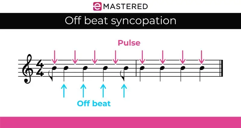 A síncope acontece quando os ritmos realçam batidas fora do ritmo ou batidas mais fracas, criando variações que tornam a música mais interessante. Em termos mais simples, quando se realça uma batida que normalmente é considerada fraca, quebra-se o ritmo habitual que a mente do ouvinte espera, o que muitas vezes pode fazer com que a linha melódica se destaque ainda mais.