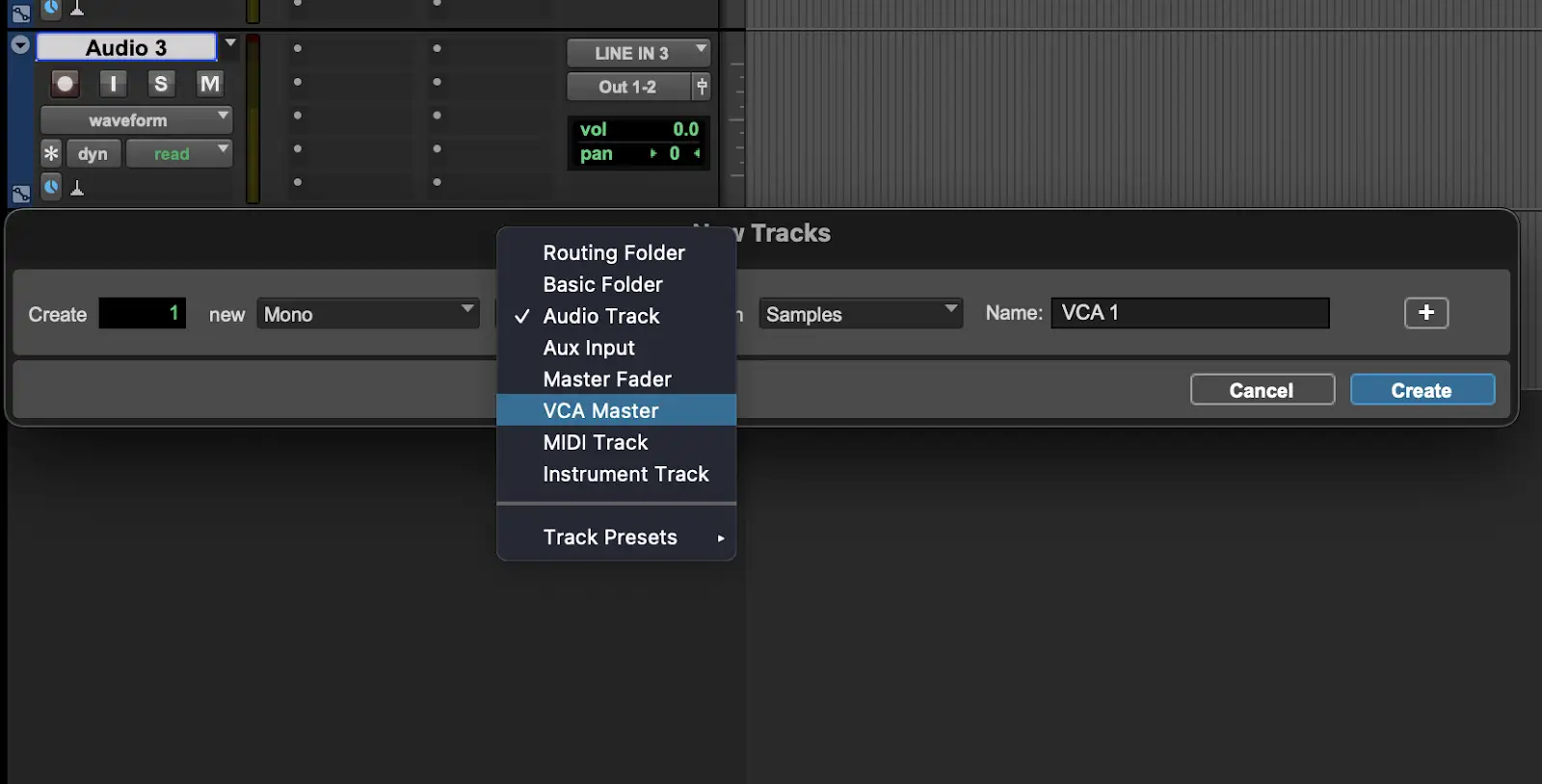 Primeiro, vá para Track>New e seleccione VCA Master no menu pendente do tipo de pista.