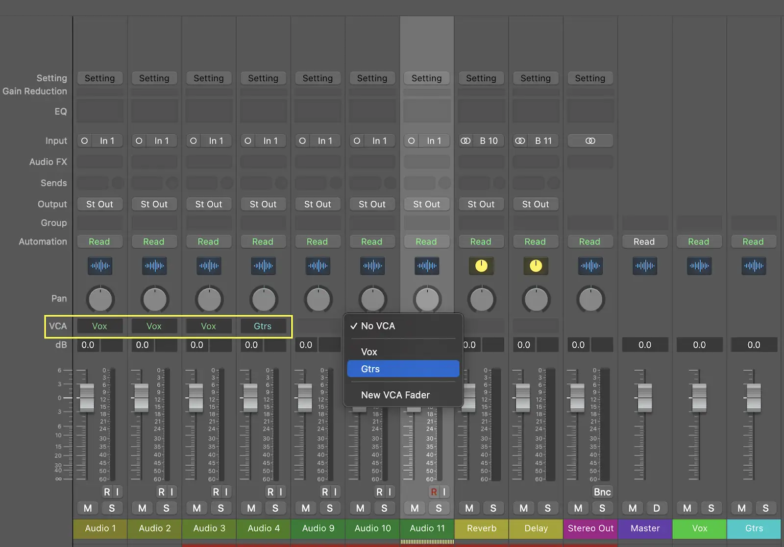 Uma vez que um VCA está, de facto, a alterar o ganho de um canal, também altera quaisquer envios pós-fader. Se estas mesmas faixas vocais estiverem atribuídas a um VCA e o puxar totalmente para baixo, não haverá sinal molhado a passar pelo retorno dos efeitos.